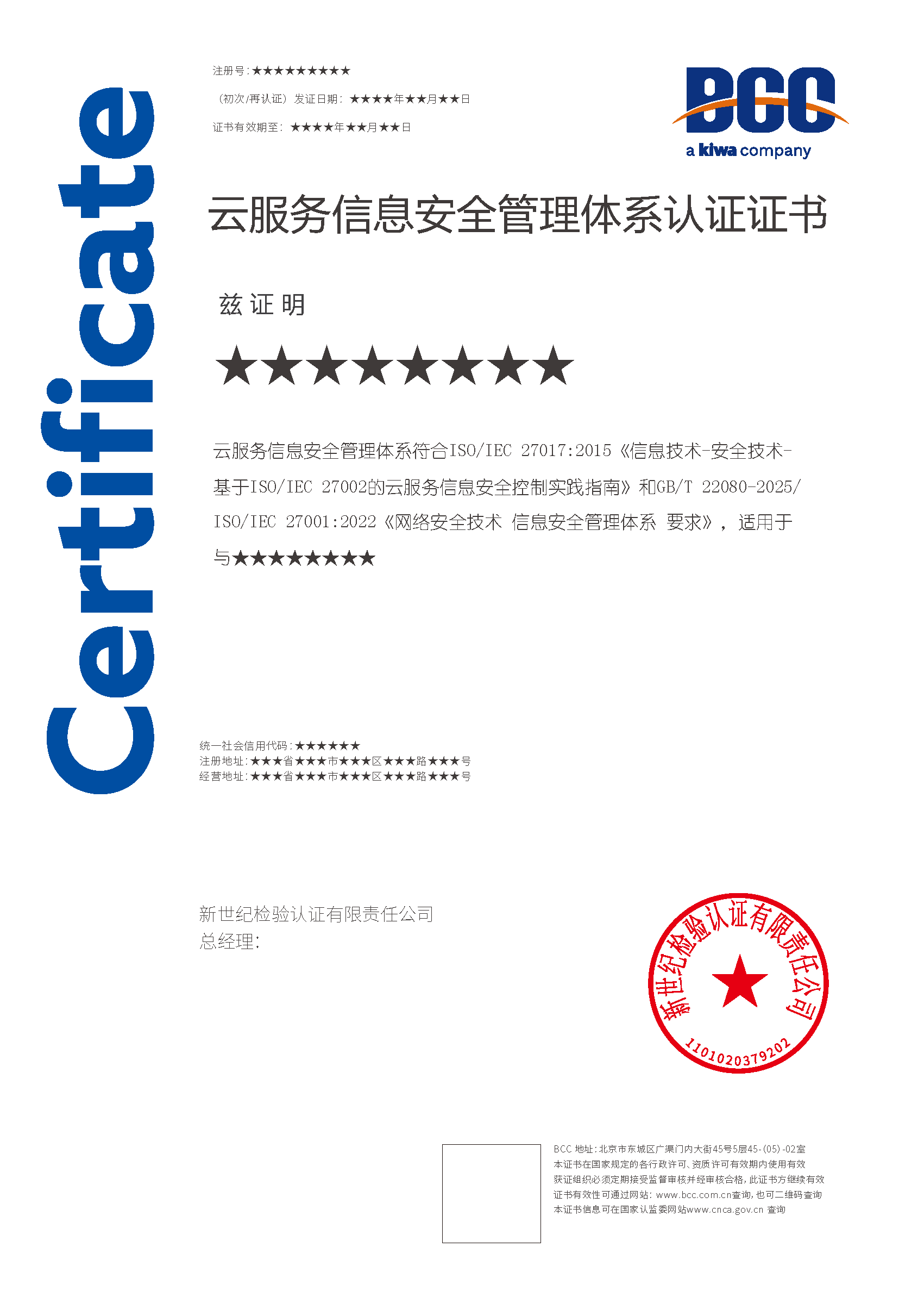 組織的信息安全管理體系(ISMS)發(fā)證機(jī)構(gòu)為BCC 時,需提供以下資料: