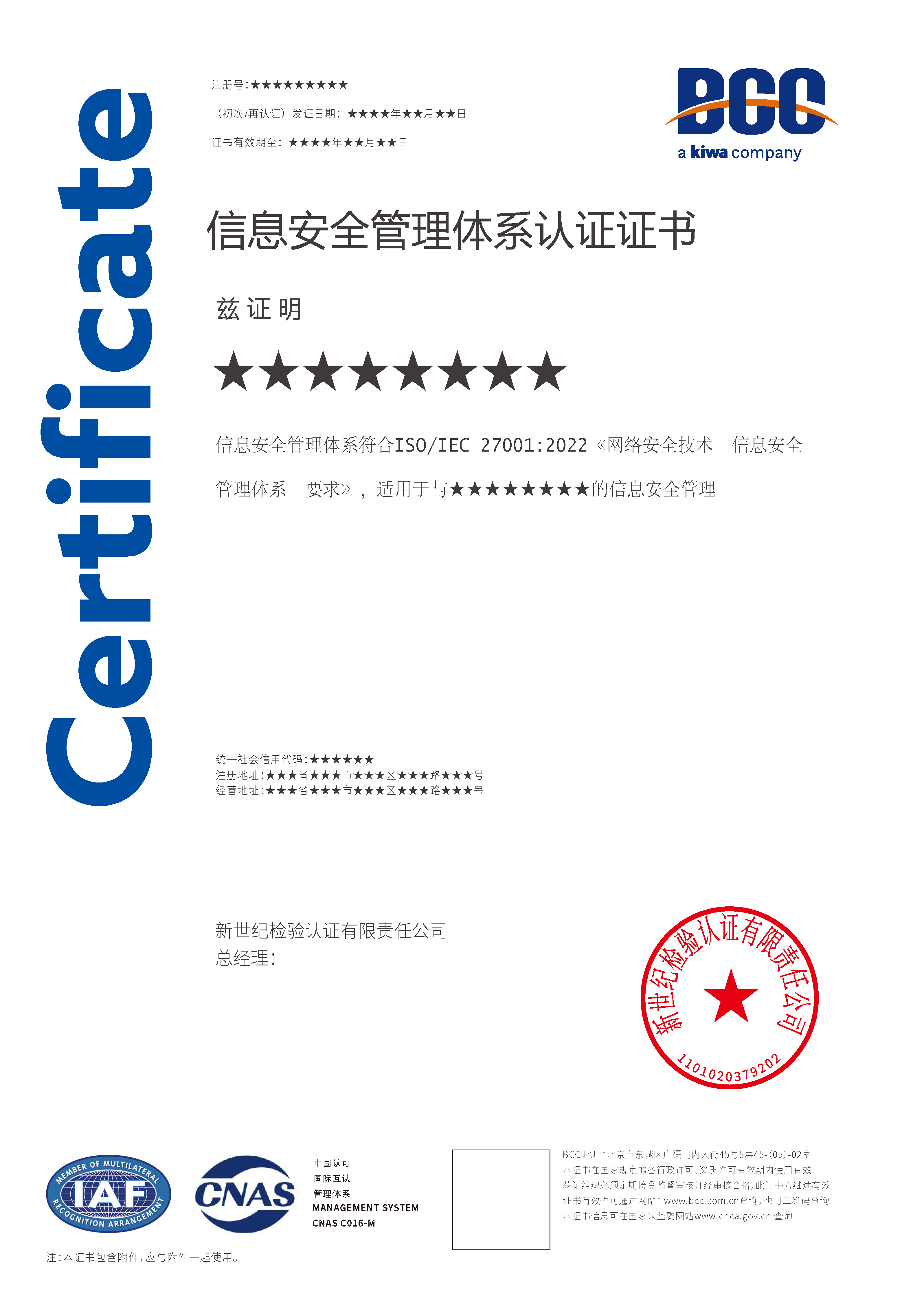 本頁涉及的認證服務中均有對應的《認證實施規(guī)則》,BCC擁有其最終解釋權(quán)。任何組織及個人未經(jīng)BCC許可,不得以任何形式全部或部分使用(法律要求除外)認證相關(guān)信息。如需獲取相關(guān)實施規(guī)則請用以下方式聯(lián)系獲?。弘娫挘?10-58579316 郵箱:fwjs@kiwa.cn